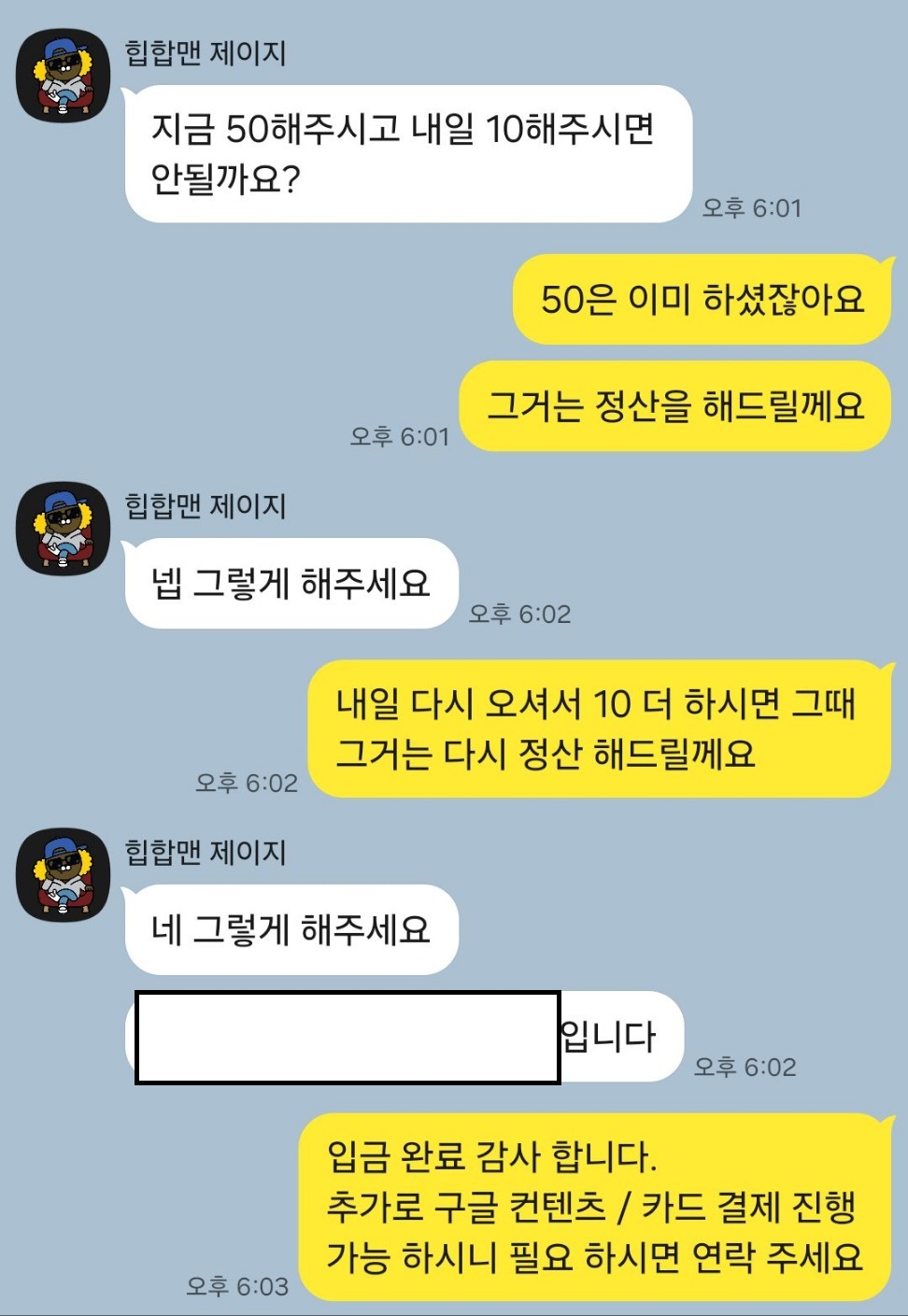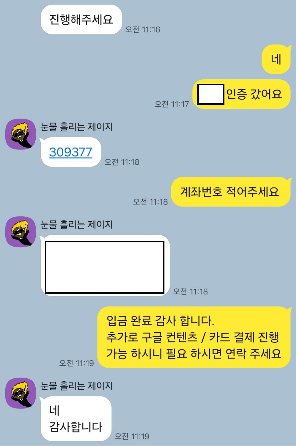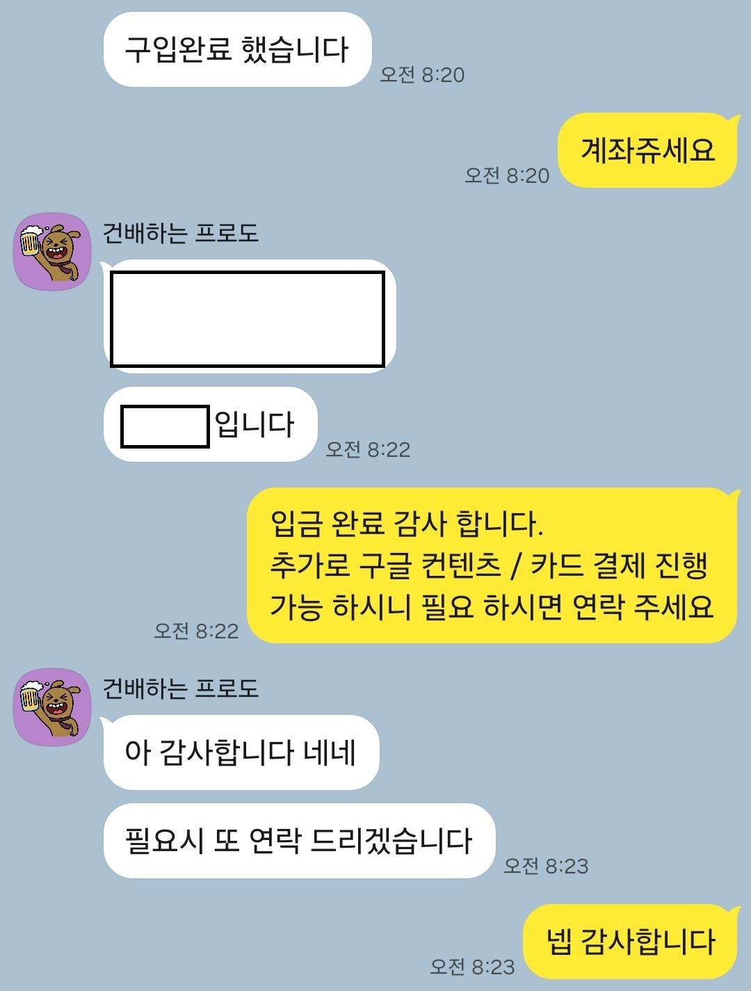 1:1 상담을 통해 상품 단가 안내와 결제에 필요한 정보 안내